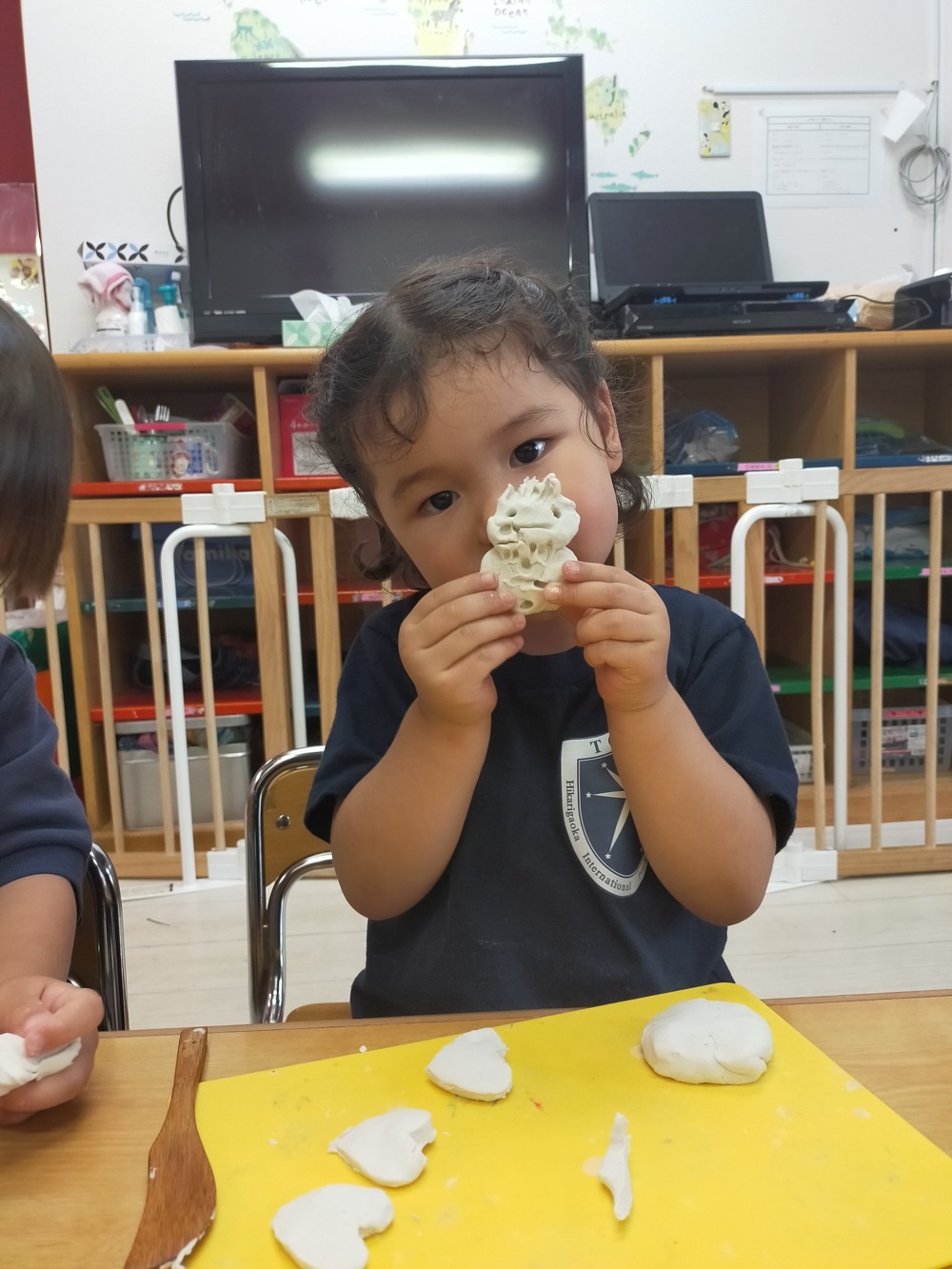 Because it is raining outside we decided to play with the clay inside our classroom together with Apple class.